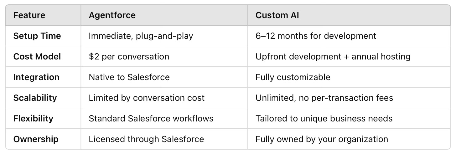 While custom AI requires a higher upfront investment, it doesn’t rely on a per-transaction pricing model like Agentforce. Over time, this can lead to significant savings for enterprises handling high volumes of data or interactions.